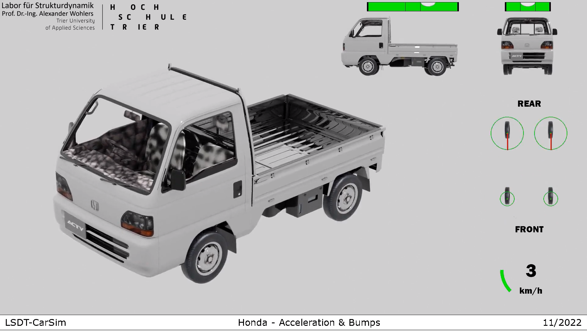 Mit dem Programm LSDT-CarSim lässt sich das dynamische Fahrverhalten von Kraftfahrzeugen berechnen. Die physikalischen Berechnungen werden mit Hilfe des Programms LSDT-DynaSim durchgeführt. Die anschliessende Visualisierung der Ergebnisse erfolgt in Blender. Das nachstehende Bild zeigt das Ersatsystem auf.